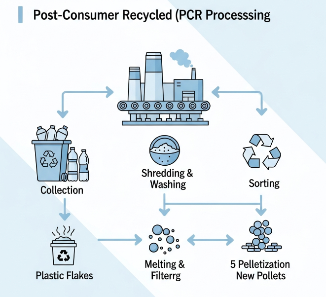 PCR står for Post-Consumer Recycled content eller Post-Consumer Resin. Det er uten tvil det mest virkningsfulle materialvalget i den sirkulære økonomien fordi det adresserer den største enkeltutfordringen: eksisterende avfall som ellers ville havnet på søppelfyllinger eller forurenset hav.