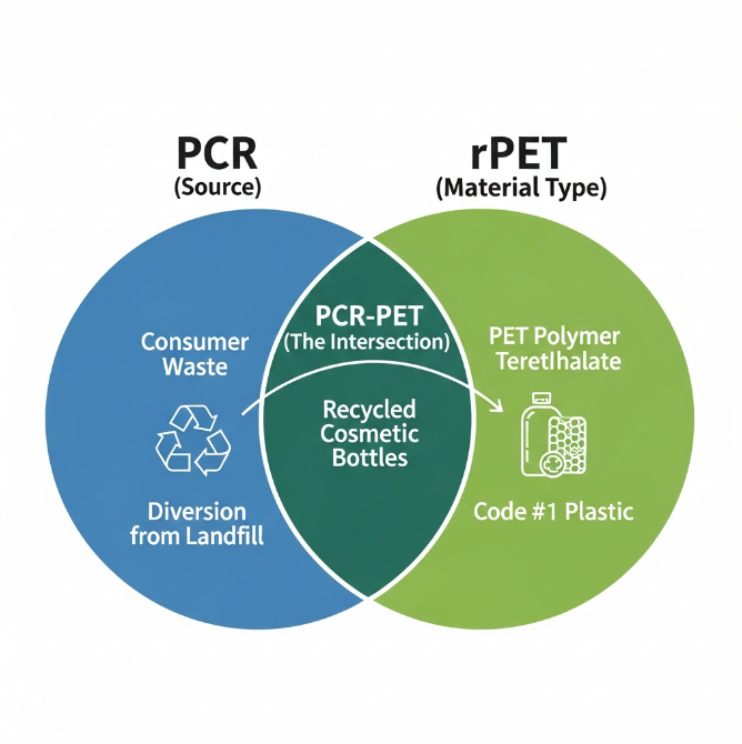 Denne omfattende veiledningen tar sikte på å avmystifisere forholdet mellom PCR og rPET, og gir kosmetikkmerker som ønsker å skape en Miljøvennlig kosmetikkflaske og miljøbevisste forbrukere med klarheten som trengs for å ta informerte, virkningsfulle beslutninger. Vi vil definere begge begrepene, dissekere kjerneforskjellene deres, analysere ytelsen deres og utforske hvorfor det er viktig å velge riktig materiale for merkevarens bærekrafthistorie.